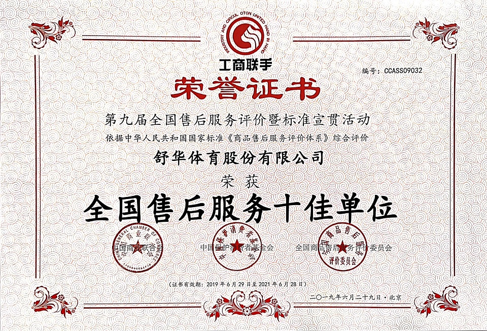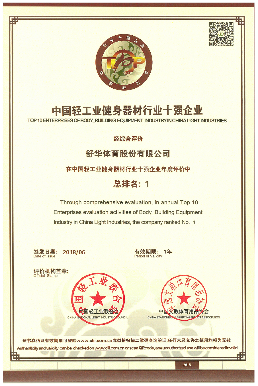 2017至2018年,谈球吧连续两年以第一名入围年度“中国轻工业健身器材行业十强企业”;2018年,谈球吧入驻平昌冬奥会“中国之家”,同年荣获“中国健身器材行业最具影响力品牌”。 From 2017 to 2018, Shuhua was named the "Top 10 Enterprise of Body Building Equipment Industry in China Light Industries " for the second consecutive year. In 20