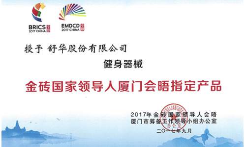 2017年,谈球吧健身器材入驻厦门金砖国家领导人会晤,并成为厦门金砖会晤指定健身器械。X6豪华智能家用跑步机荣获中国好设计金奖。 2017, Shuhua fitenss equipment presented itself in Xiamen as the designated fitness equipmentof Xiamen BRICS summit. X6 luxurious home use treadmill won gold award of China Good Design.